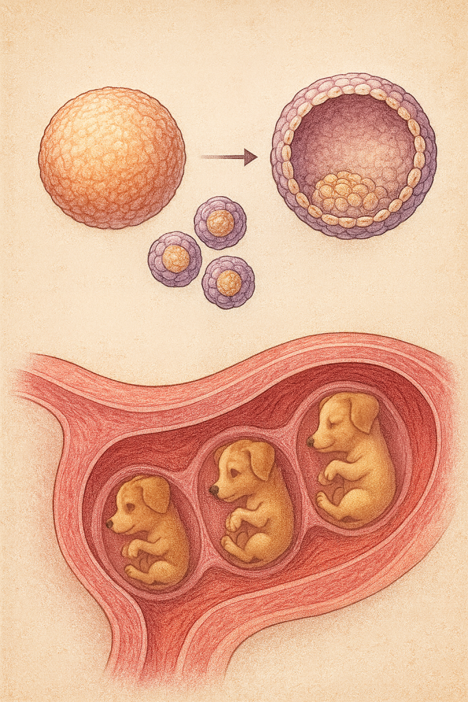 Die Ausbildung der Organe ist abgeschlossen. Die Föten sehen nun aus wie Hunde. Kopf und Rumpf sind unterscheidbar. Das Geschlecht ist bestimmbar. Die Fellfarbe beginnt sich zu entwickeln. Der Herzschlag der Föten ist per Stethoskop hörbar. Die Zitzen der Hündin werden dunkler und schwellen an.