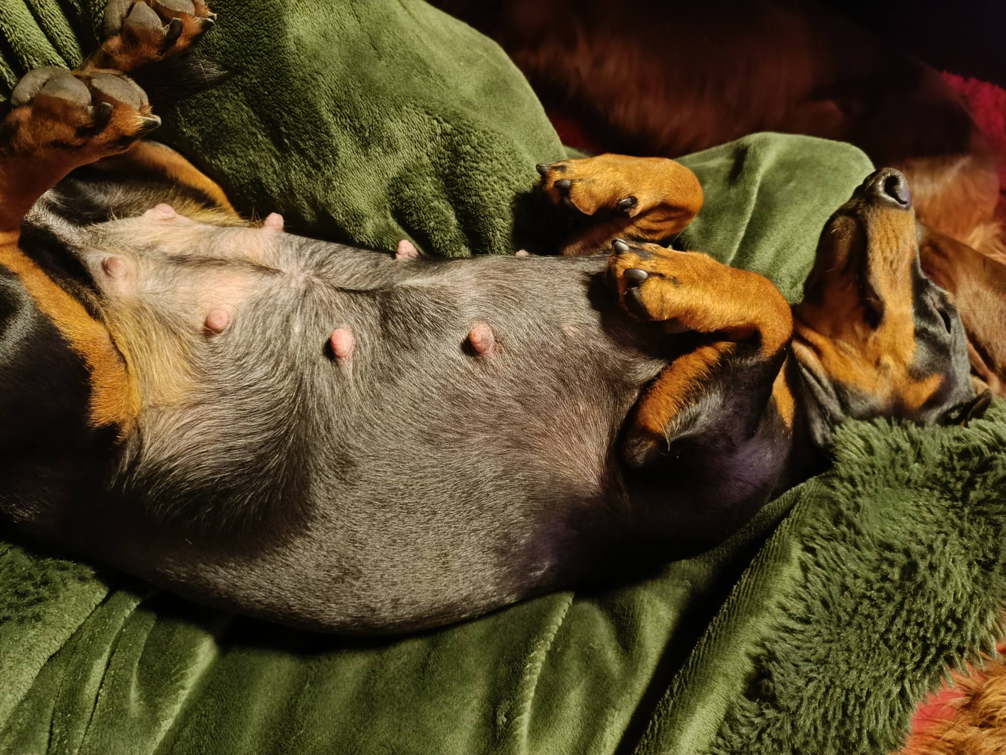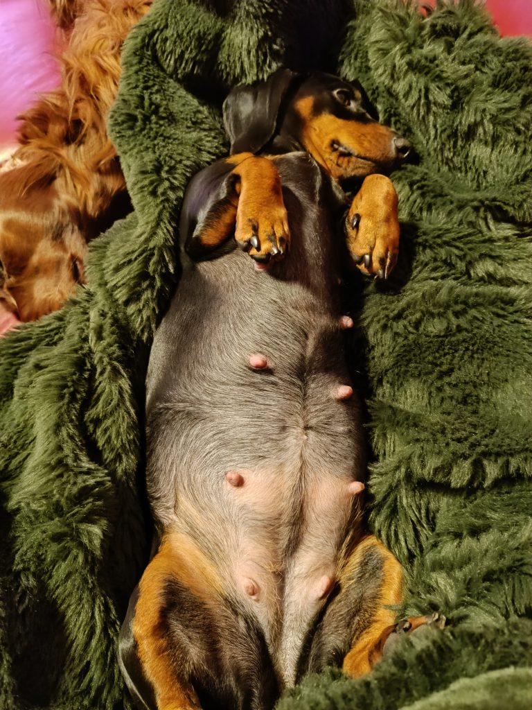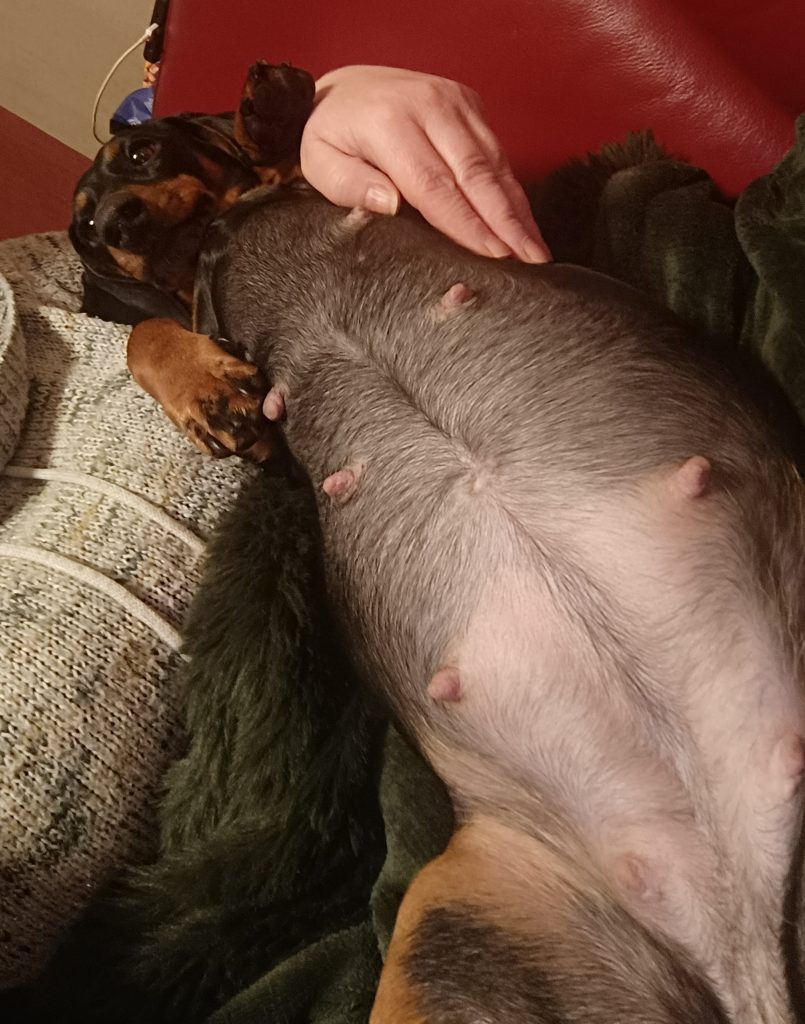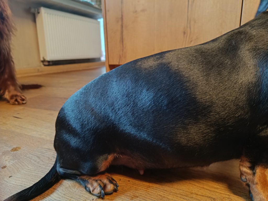 Manche Hündinnen leiden unter morgendlicher Übelkeit – das konnten wir bei Liselotte nicht beobachten. Sie frisst nach wie vor gern. In dieser Woche war sie besonders anhänglich.